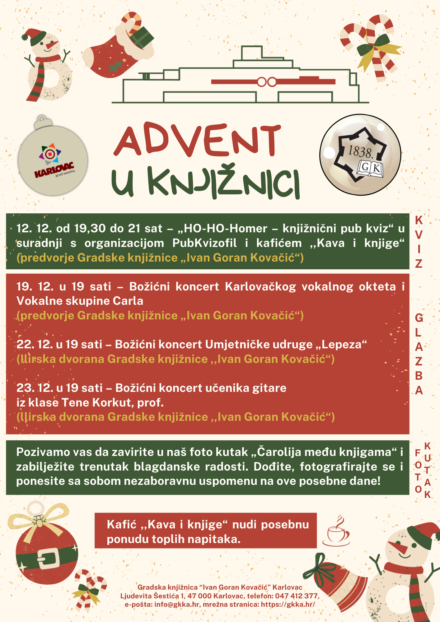 Advent je vrijeme radosti, zajedništva i stvaranja nezaboravnih trenutaka s ljudima koji nas okružuju. Gradska knjižnica „Ivan Goran Kovačić“, kao mjesto susreta, znanja i inspiracije, poziva vas da ovo blagdansko razdoblje provedete s nama.