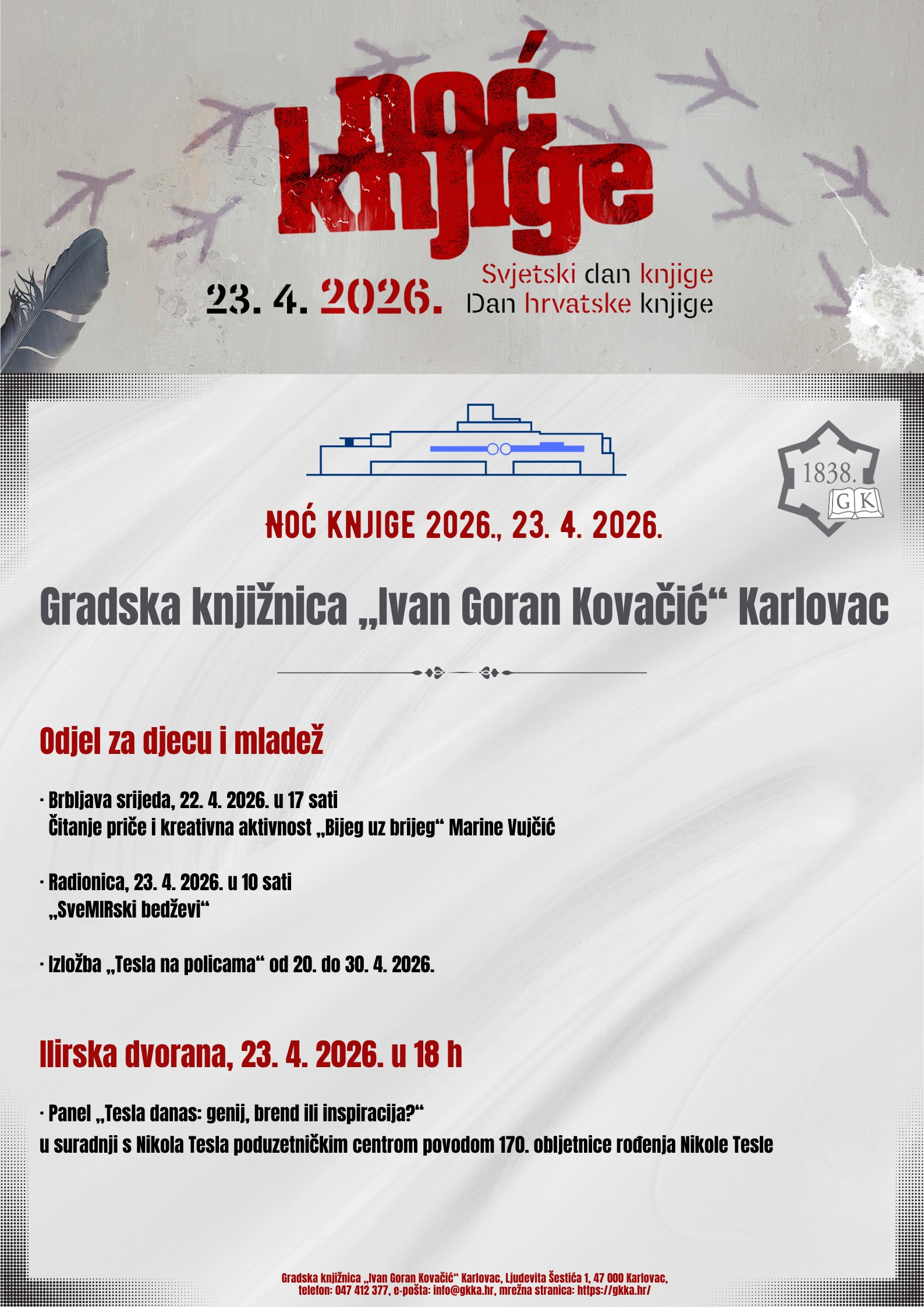 Povodom 170. obljetnice rođenja Nikole Tesle u Gradskoj knjižnici „Ivan Goran Kovačić“ Karlovac u Noći knjige, 23. travnja u 18 h održat će se panel „Tesla danas: genij, brend ili inspiracija?“ u suradnji s Nikola Tesla poduzetničkim centrom. Panel otvara pitanja suvremenog društva u kojem tehnologija sve snažnije oblikuje svakodnevicu, znanstvenici postaju novi influenceri, a teme energije i održivosti dobivaju ključnu važnost. U takvom kontekstu posebno se ističe uloga čitanja kao temelja kritičkog mišljenja, razvoja empatije i svjesnog sudjelovanja u društvu. Sudionici panela (influenceri, znanstvenici, osobe iz javnog života) povezivat će znanost, vizije razvoja i popularnu kulturu, promišljajući Teslino nasljeđe u današnjem vremenu.