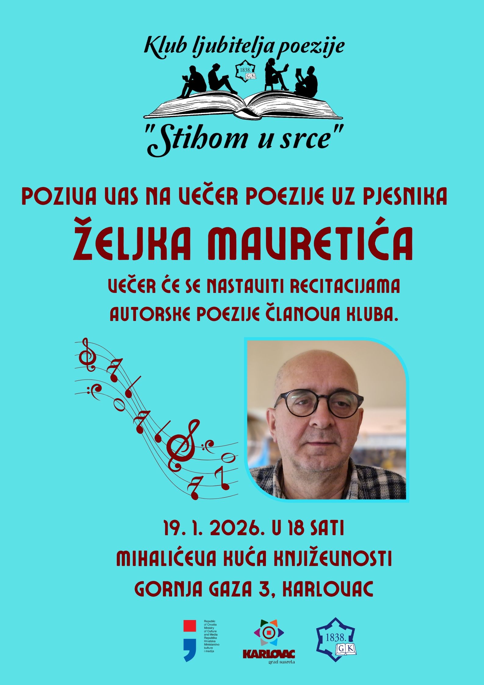 Klub ljubitelja poezije „Stihom u srce“ poziva vas na poetsku večer s karlovačkim pjesnikom, književnikom i knjižničarom Željkom Mavretićem. Mavretić je dugogodišnji je sudionik brojnih nacionalnih i međunarodnih književnih manifestacija u Hrvatskoj i regiji. Osnivač je Književnog kruga Karlovac te pokretač Nagradnog natječaja za kratku priču „Zlatko Tomičić“. Kao urednik, kritičar i autor, snažno je obilježio karlovačku književnu i kulturnu scenu.
