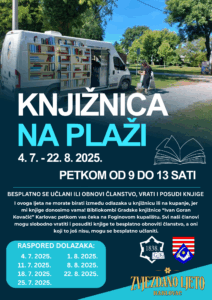 Karlovčani će i ove godine imati Knjižnicu na plaži na Foginovom kupalištu. Svakog petka u razdoblju od 4. srpnja do 22. kolovoza od 9 do 13 sati Bibliokombi Gradske knjižnice “Ivan Goran Kovačić” bit će parkiran na najpopularnijem karlovačkom kupalištu. Svi članovi moći će posuditi ili vratiti knjige, besplatno obnoviti članstvo ili ako još niste, besplatno se učlaniti. Raspored dolazaka u srpnju je: 4.,11.,18. i 25.7., a u kolovozu je; 1., 8. i 22. 8. 2025. Programe Službe pokretne knjižnice financijski podupire Karlovačka županija.