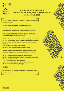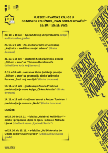 Mjesec hrvatske knjige u Gradskoj knjižnici „Ivan Goran Kovačić“ traje od 15. listopada do 15. studenoga. Iako knjižnice tijekom cijele godine potiču čitanje, u ovom razdoblju njihovi programi i poruke postaju još snažniji, stvarajući atmosferu jedne od najljepših svjetskih svetkovina – svetkovine čitanja. Knjižnice su svakodnevno posvećene knjigama i čitateljima, no u Mjesecu hrvatske knjige uključuju svoj „mlazni pogon“ kako bi pokazale da se s knjigom može putovati daleko, visoko – pa i do samog Mjeseca. I još dalje. U Gradskoj knjižnici „Ivan Goran Kovačić“ pripremili smo za vas više od dvadeset događanja: književne večeri, izložbe, radionice, pjesničke susrete i zanimljiva gostovanja. Ove godine posebno ističemo gostovanja poznatog književnika Ante Tomića i kantautora Zorana Predina, što će zasigurno biti pravi kulturni doživljaj za sve ljubitelje književnosti i glazbe. Ponosno najavljujemo i pjesničku večer Kluba ljubitelja poezije „Stihom u srce“, 31. 10. u 18 sati, što će biti prvo događanje u Mihalićevoj kući književnosti, koja otvara vrata kao novi prostor za susrete s knjigom, autorima i kreativnim idejama. Time se dodatno širi mogućnost druženja i otkrivanja svijeta književnosti u srcu Karlovca. Vjerujemo da će svi naši korisnici, gosti i prijatelji knjižnice pronaći nešto za sebe jer smo programe ove godine osmislili pod sloganom: „Odabrali knjižničari“. Naziv je to i izložbe u Izložbenom salonu „Ljudevit Šestić“, uz odabir i preporuku djela Naklade Ljevak za djecu i odrasle, koja su za vas odabrali knjižničari.