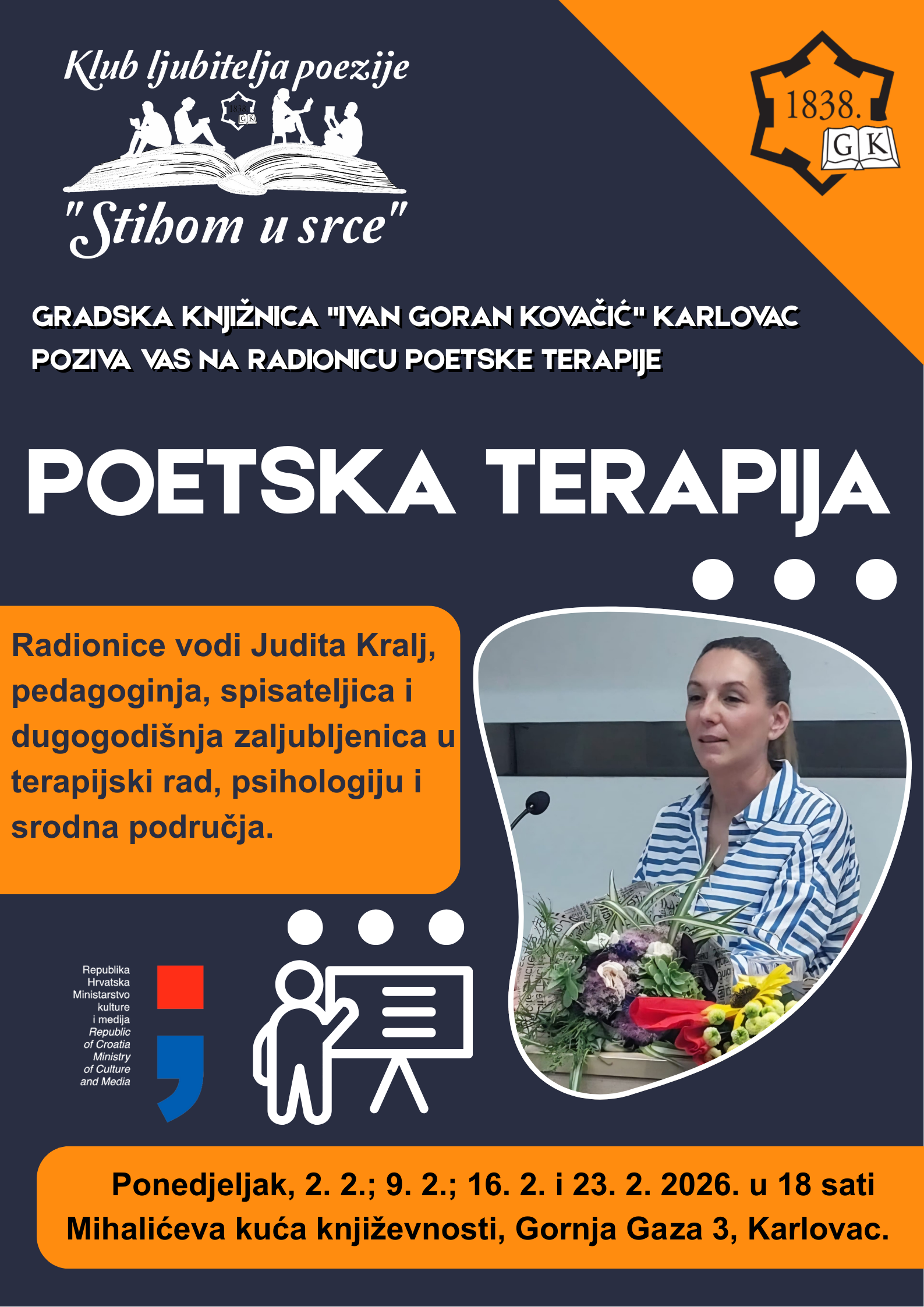 Pozivamo vas na 3. radionicu poetske terapije u sklopu Kluba ljubitelja poezije „Stihom u srce“ koja će se održati: