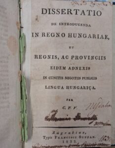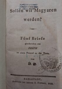 Ovo je prvo predstavljanje knjige nakon izlaska iz tiska, a riječ je o knjizi u kojoj je autor proveo temeljnu filološku i diskursnu analizu brošure Sollen wir Magyaren werden? Fünf Briefe geschrieben aus Pesth an einen Freund an der Theis / von D. H. (hrv. Trebamo li postati Mađari? Pet pisama napisanih iz Pešte prijatelju na Tisi / autora D. H.), koja je objavljena 1833. godine u Karlovcu, u izdavačkoj kući Johanna Nepomuka Prettnera. Napisana je na njemačkom jeziku, uz nekoliko fragmenata na mađarskom, latinskom te nekoliko slavenskih jezika.