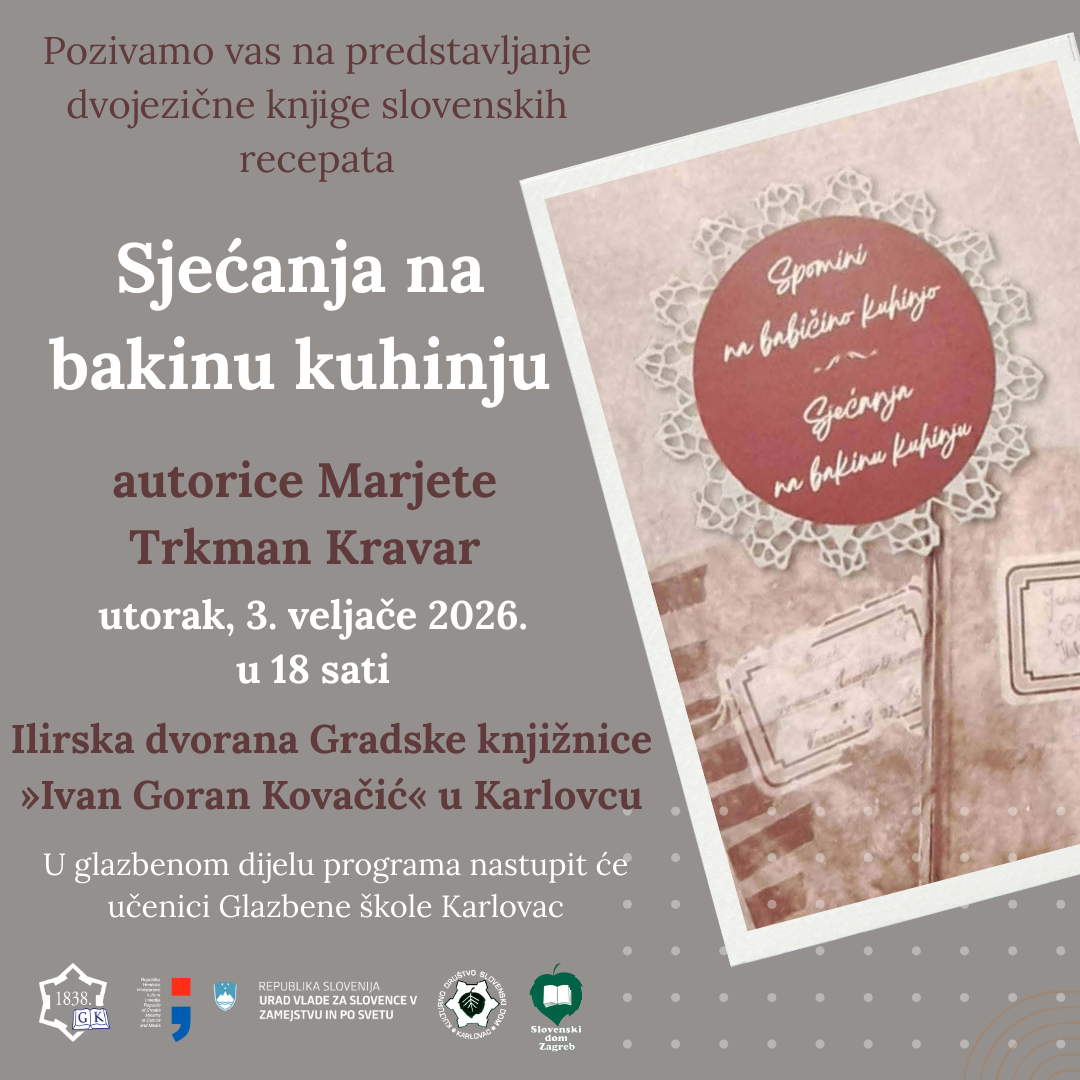 Spomini na babičino kuhinjo / Sjećanja na bakinu kuhinju autorice Marjete Trkman Kravar predstavljena je i karlovačkoj publici u sklopu obilježavanja Prešernova dana, slovenskog kulturnog praznika.